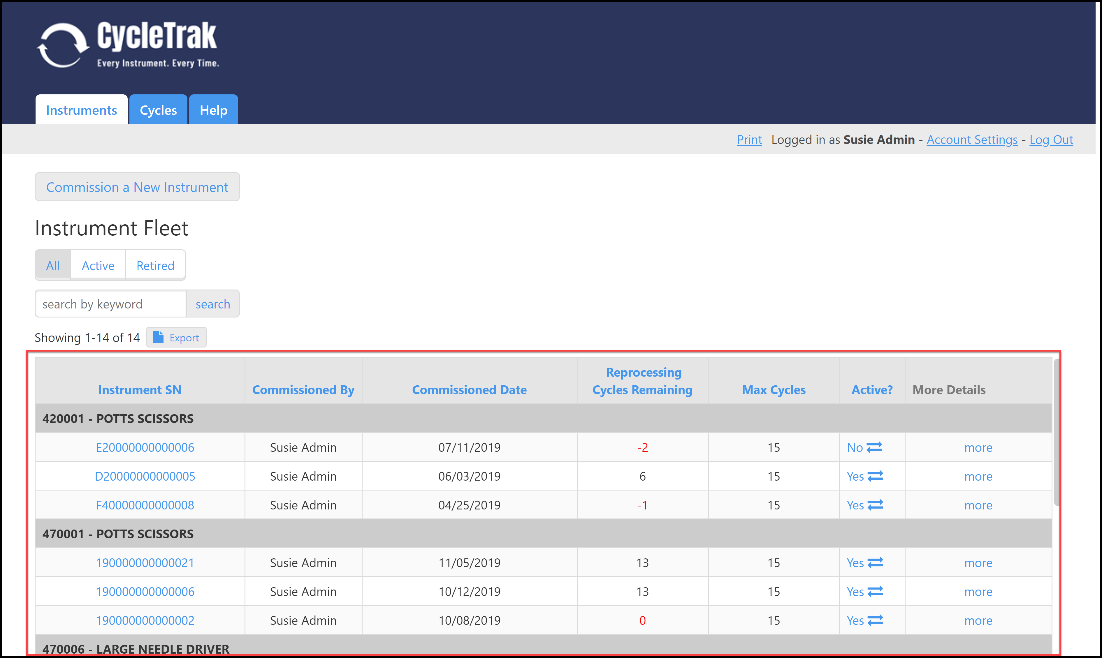 The Instruments Dashboard allows you to view and manage your fleet of instruments. This is where you will setup (“Commission”) a new instrument and where you will remove (“retire”) an instrument from your fleet. You can also search, view and export your fleet information.
