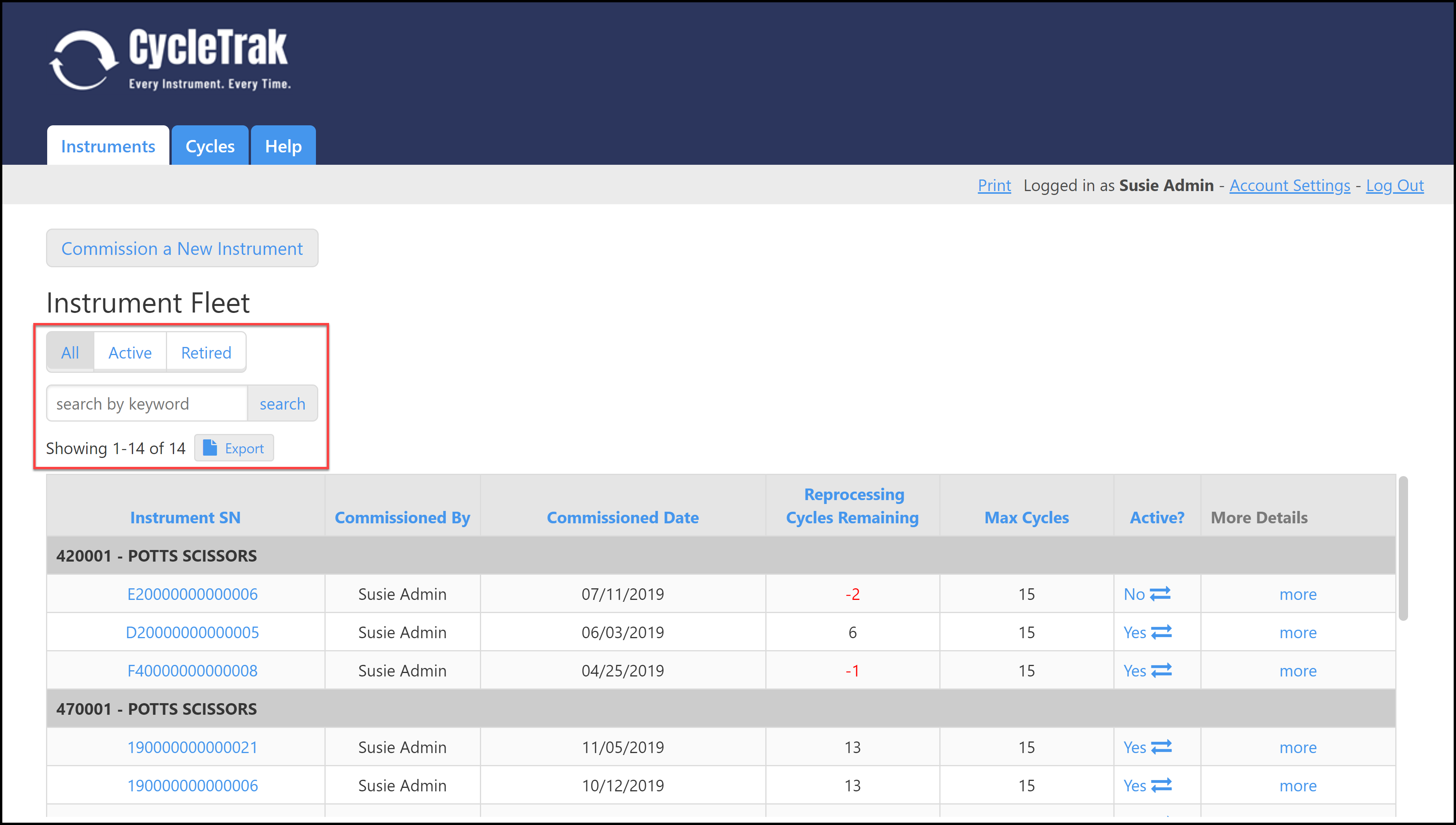 To filter your fleet information use the All/Active/Retired menu tabs. Select the All tab to display your entire fleet. Selecting the Active tab displays only instruments that are Active=Yes. Selecting the Retired tab display only retired instruments.