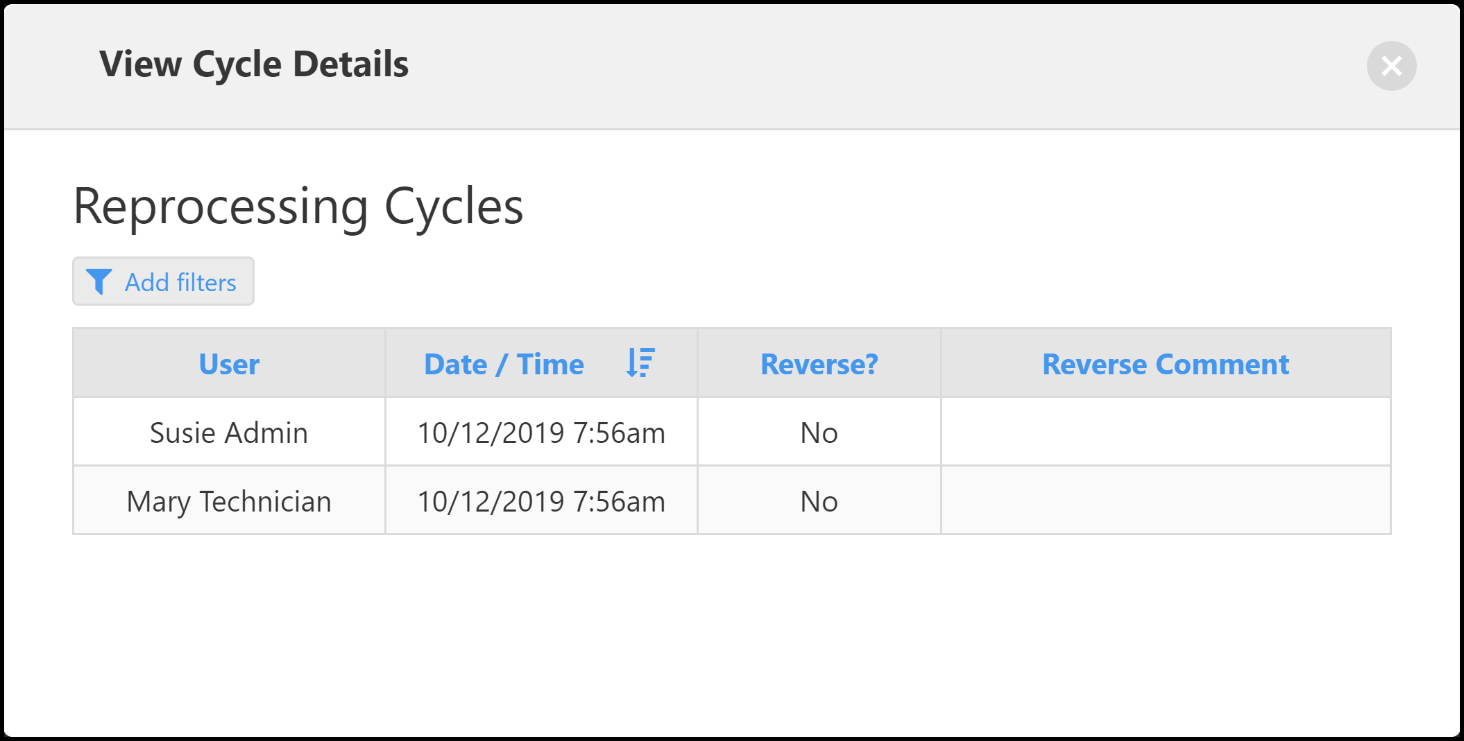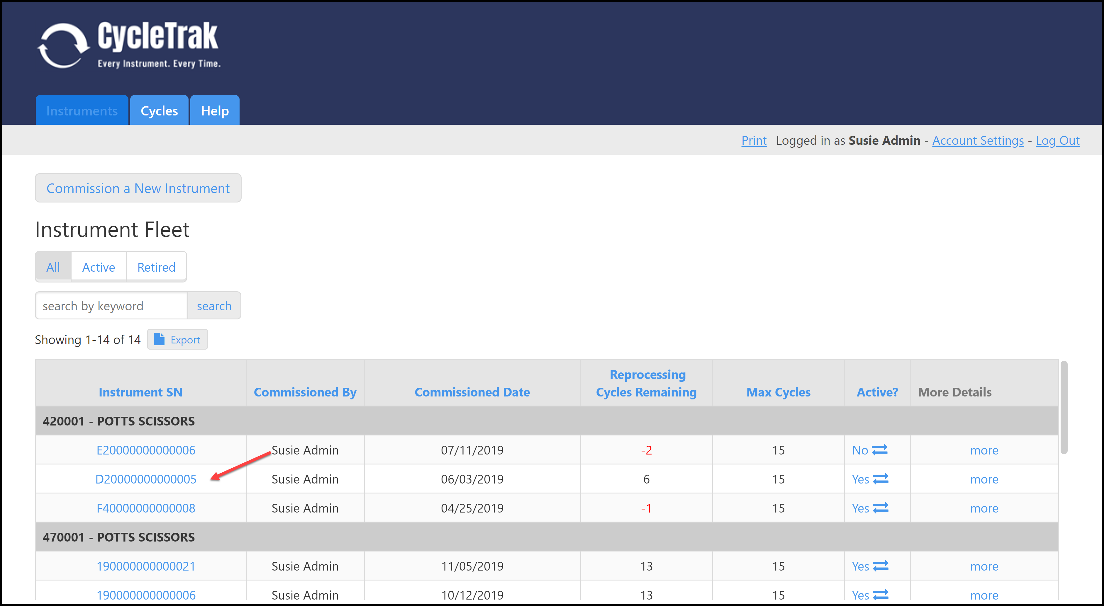 You can view the details of the reprocessing cycles for an instrument from the Instrument Dashboard. Place your cursor over the Instrument SN of a specific instrument and click your mouse as shown below.