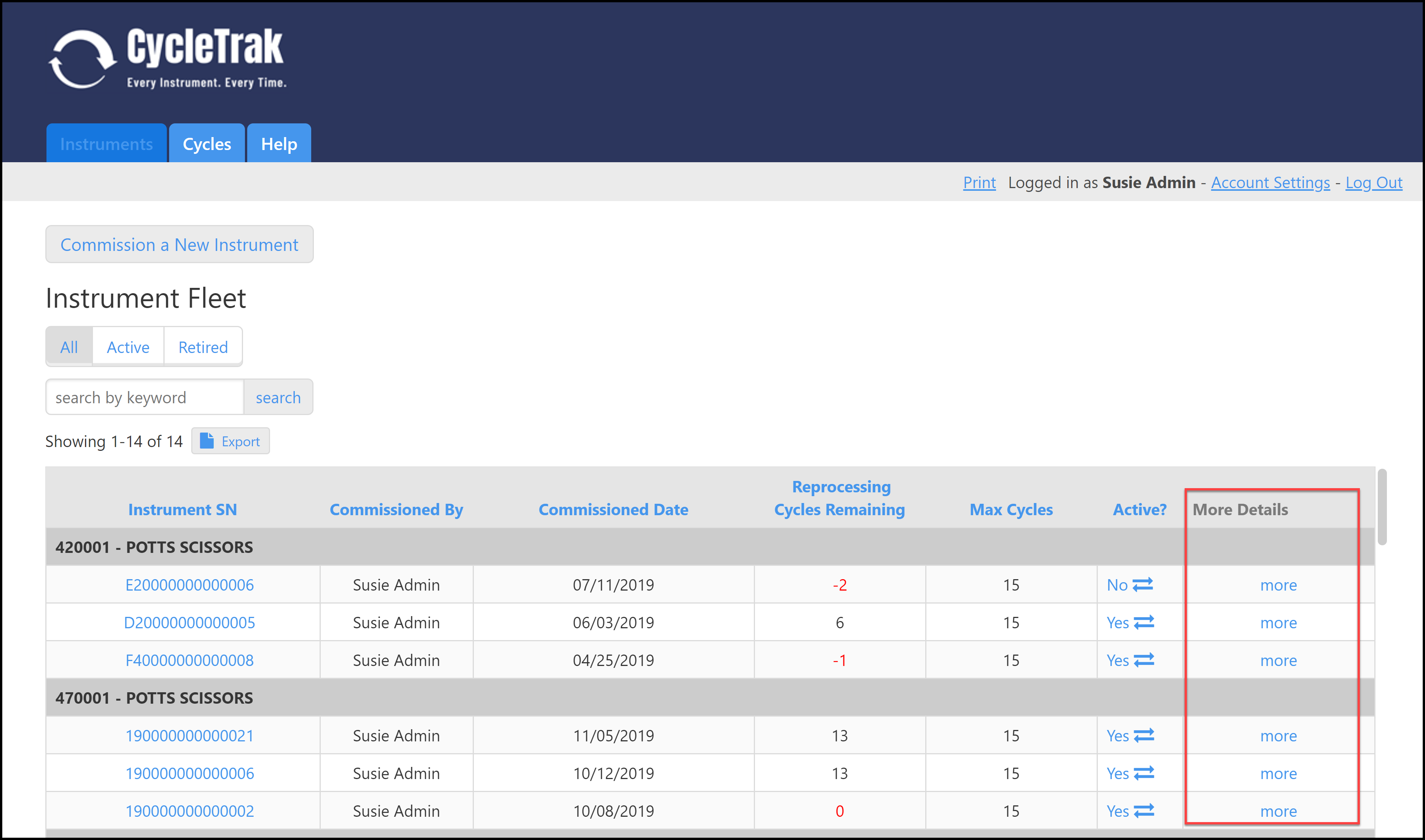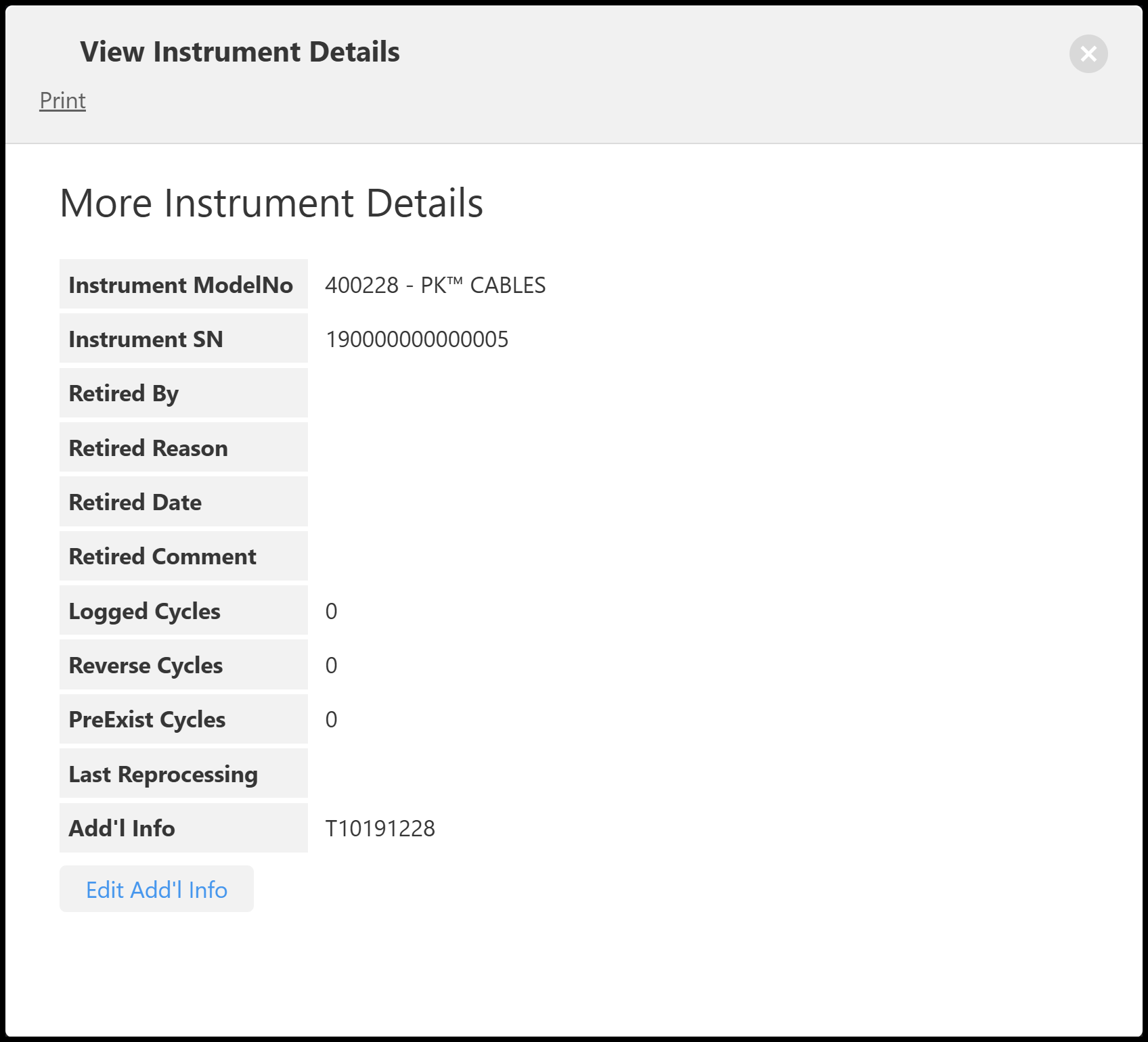 To close this screen click the “X” in the upper right corner of the screen; you will be returned to the Instruments Dashboard.