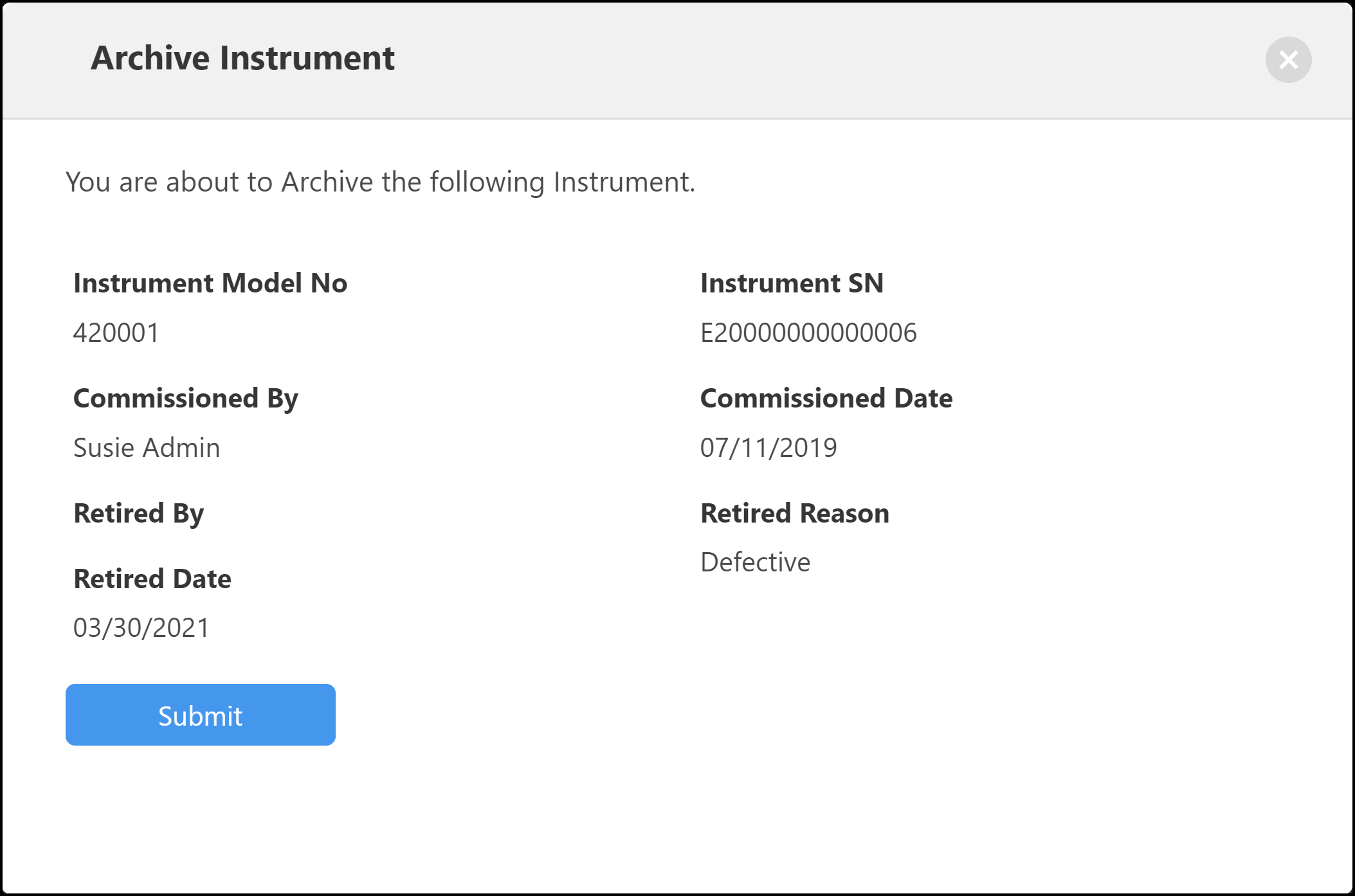Review all the information on the screen. If you want to continue with the Archive process press the Submit button. To close this screen, click the “X” in the upper right corner of the screen; the Archive function will be abandoned.
